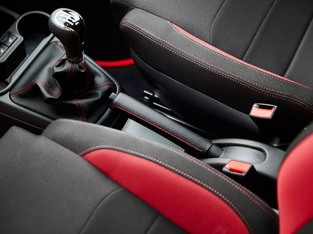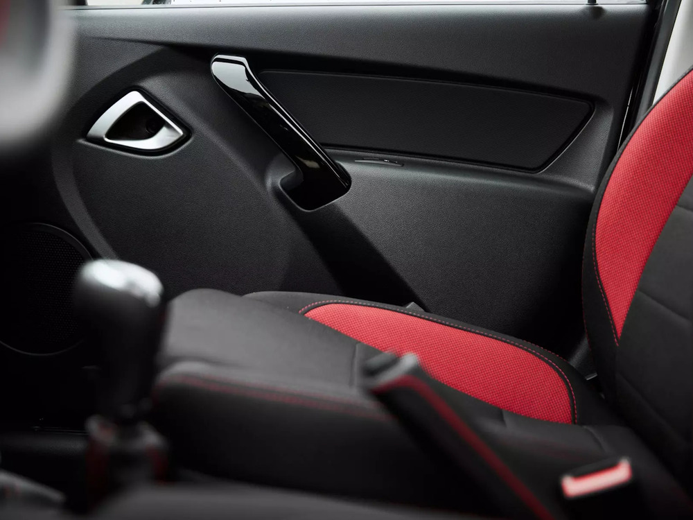 Обивка сидений ткань. Цвет черный с красными элементами