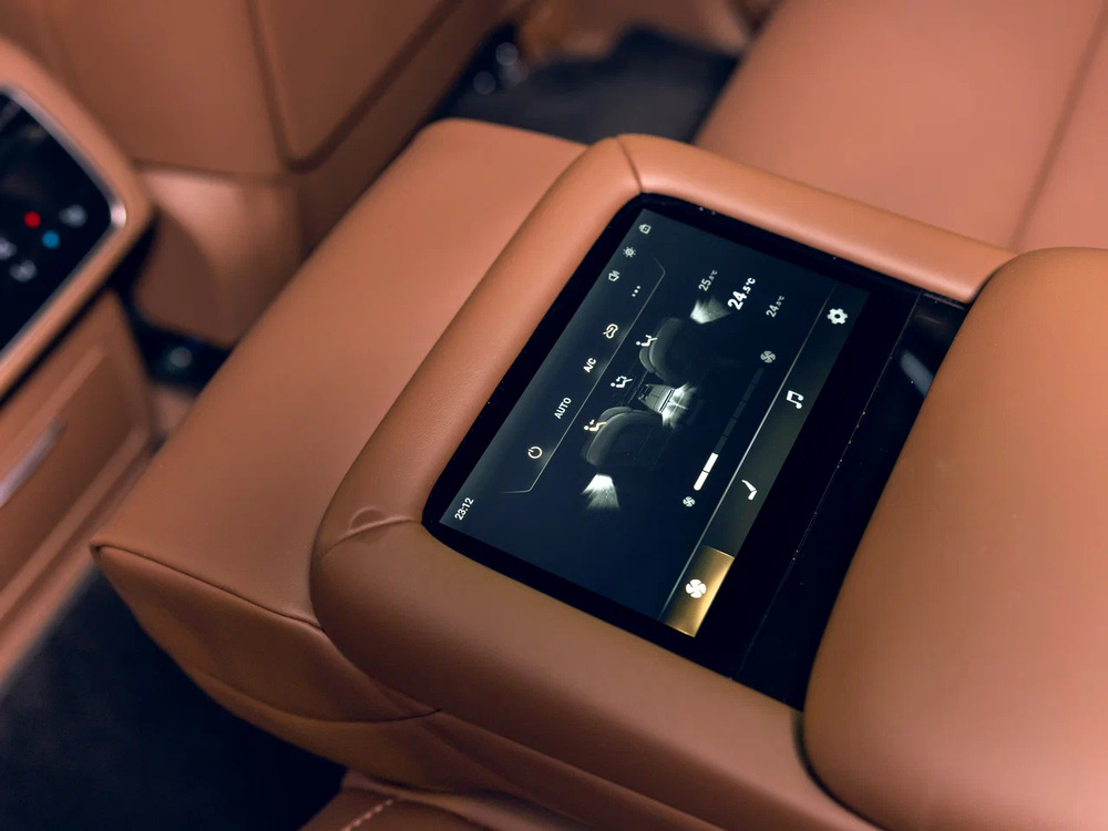 Центральный подлокотник сидений заднего ряда с подстаканниками, отсеком для хранения и сенсорным экраном управления функциями автомобиля